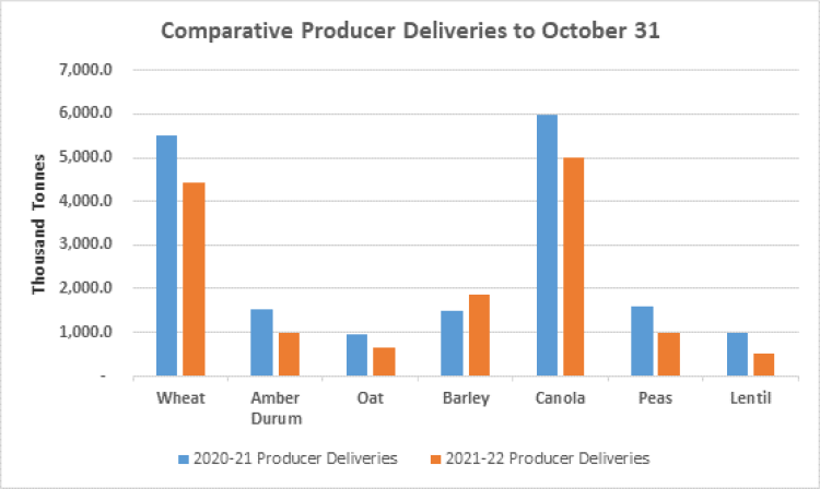 The latest CGC numbers on Canadian crop movement from August 1 through October 31 show producer deliveries for most crops are lower due to reduced carryover into this crop year and the drought-reduced crop. The notable exception is barley. Crop year to date barley deliveries into licensed facilities are 1.86 million tonnes compared to 1.48 million tonnes a year ago.