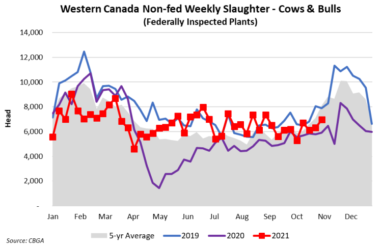 Western Canada cow slaughter is 274,079 head to the week ending October 30, up 12.7% from 2020 but 0.7% below the 5-year average. The weekly pace of cow slaughter increased in May this year and has been above the 5-year average in 18 of the last 27 weeks.