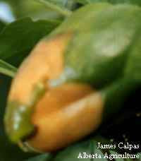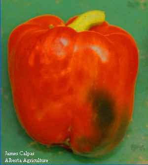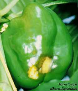 The symptoms of sunscald on the pepper fruit are very similar to those for blossom end rot. Soft, tan coloured sunken lesions develop fruit that are exposed to direct sunlight. It is important to adjust pruning practices to ensure that all fruit are shaded from direct sunlight. Applying shading to the greenhouse during the summer months will also help reduce the incidence of sunscald. Temperatures of exposed fruit can often be 10 °C higher than shaded fruit, reaching over 35 °C during the mid day of a typical hot, sunny Alberta afternoon, even when air temperatures in the greenhouse are maintained below 27 °C. Fruit temperatures over 35 øC should be avoided (Portree 1996).