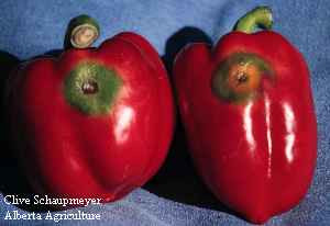 Symptoms of infection on the leaves includes blackish-brown circular spots, or tan spots bordered by a black margin (Howard et al 1994). Symptoms on ripening fruit are quite dramatic with orange to yellow spots surrounded by a green margin, or green spots on a background of the ripe fruit colour of red, yellow or orange. Not all fruit from infected plants may develop fruit symptoms, experience in Alberta pepper greenhouses has shown that only about one-third of the fruit from infected plants will develop symptoms.