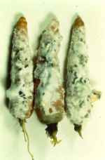 This is the most destructive disease of carrots in Alberta. The infectious ascospores of this fungus are abundant as a consequence of the build-up of the disease on millions of acres of canola and bean crops. Carrots may show little or no damage incidence in the field but following washing and storage white mold outbreaks often occur on the stored roots. Only a small percentage of the roots may be initially infected but the fungus mycelium can move very rapidly from carrot to carrot. In a matter of weeks the whole storage container may become a mass of white mold and black sclerotia surrounding each and every carrot.
