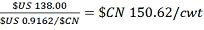 To estimate the applicable US/Canadian dollar exchange rate as of next June, the futures market is again the best tool. The June Canadian dollar futures contract is closest in time to the June live cattle futures, and that quote is adequate. (If the Canadian dollar was actually being hedged, however, it would be preferable that the September futures be used, since the June dollar futures would expire before the cattle are sold in June.) Assume that the June Canadian dollar future is at US $0.9162. Converted to Canadian funds, the $US 138.00/cwt slaughter steer price becomes: