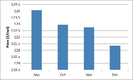 Figure 3. Five year average Alberta 500-600 lb steers prices seasonality during fall