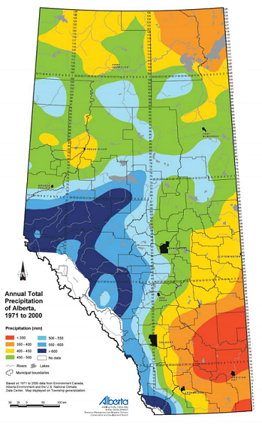 Alberta offers a wide range of mapping resources to enhance understanding of many diverse subjects and issues. The two major types of maps are reference maps and thematic maps. To the right is a typical thematic precipitation map indicating precipitation across the province. Thematic maps depict information about a specific topic in a geographic area. For more information:
