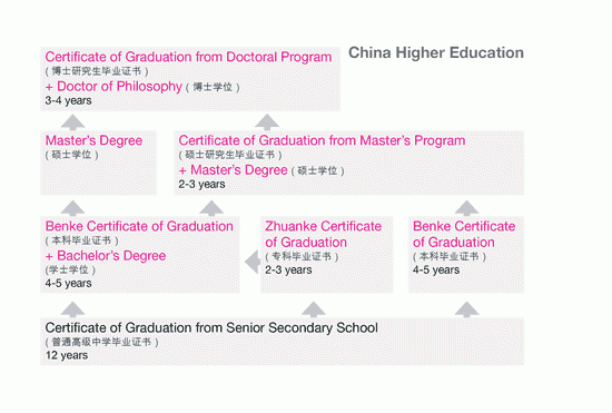 | 本科毕业证书 本科毕业文凭 (Certificate of Graduation (4 to 5- year undergraduate benke program)) | Certificate of Graduation from Senior Secondary School (12 years) | 4 to 5 years | Generally compares to the completion of a four-year Bachelor’s degree. |