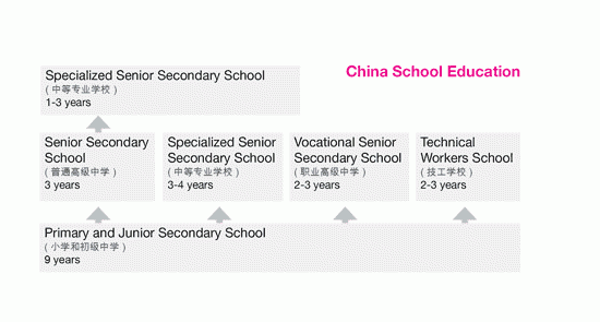 China has adopted the current 12-year school system since the early to mid-1980s. The academic stream consists of 9 years of primary and junior secondary education and 3 years of senior secondary education. The Certificate of Graduation from Senior Secondary School gives access to university study.