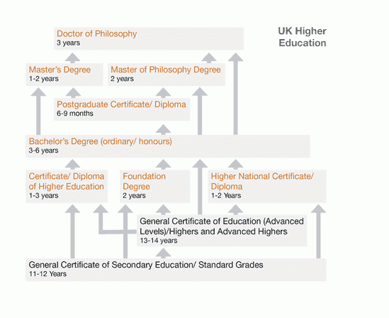 Higher Education in the United Kingdom follows a 3-tier degree structure – bachelor’s, master’s and doctoral-level studies. Other possible undergraduate qualifications include: Higher National Certificates and Diplomas, Certificates and Diplomas of Higher Education and Foundation degrees. Graduate qualifications include Postgraduate Certificates and Diplomas, Master’s degrees and Doctoral degrees.