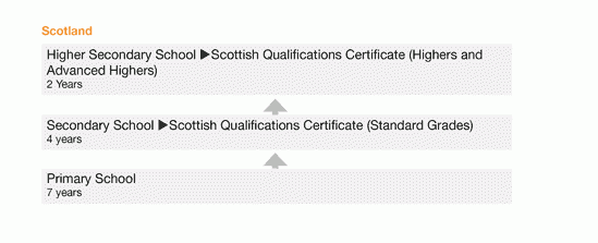 | Scottish Qualifications Certificate (Upper Secondary) – National Courses at Higher and Advanced Higher Levels | Completion of lower secondary school (11 years) | 2 years | Generally compares to the completion of a High School Diploma. |