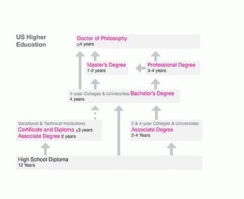 Higher education institutions in the US award certificates, diplomas and degrees from the associate to doctoral levels.
