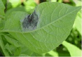 - A small amount of spore production (sporangia), which appears as fluffy, white growth on the edges of lesions, may occur at the edges of fresh lesions on the underside of affected leaves