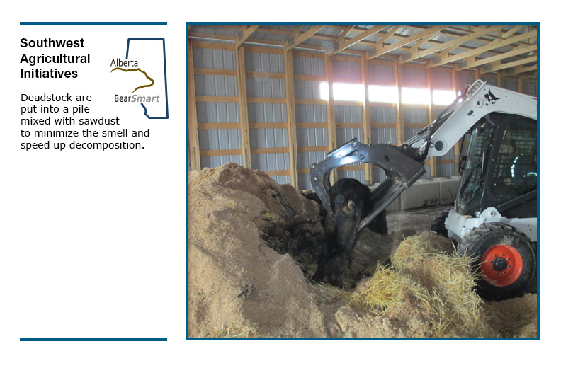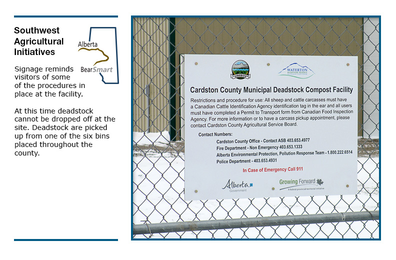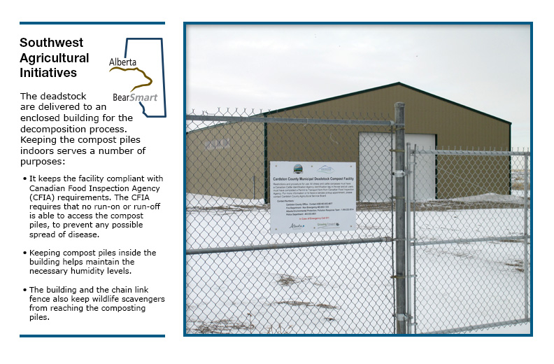 With financial support from a variety of sources, this facility is modelled after similar facilities in Montana. Deadstock are removed from ranches in bear territory and brought in for composting. The carcasses compost in few weeks, emit virtually no odours that would attract bears or scavengers, and the facility operates on a very small budget.
