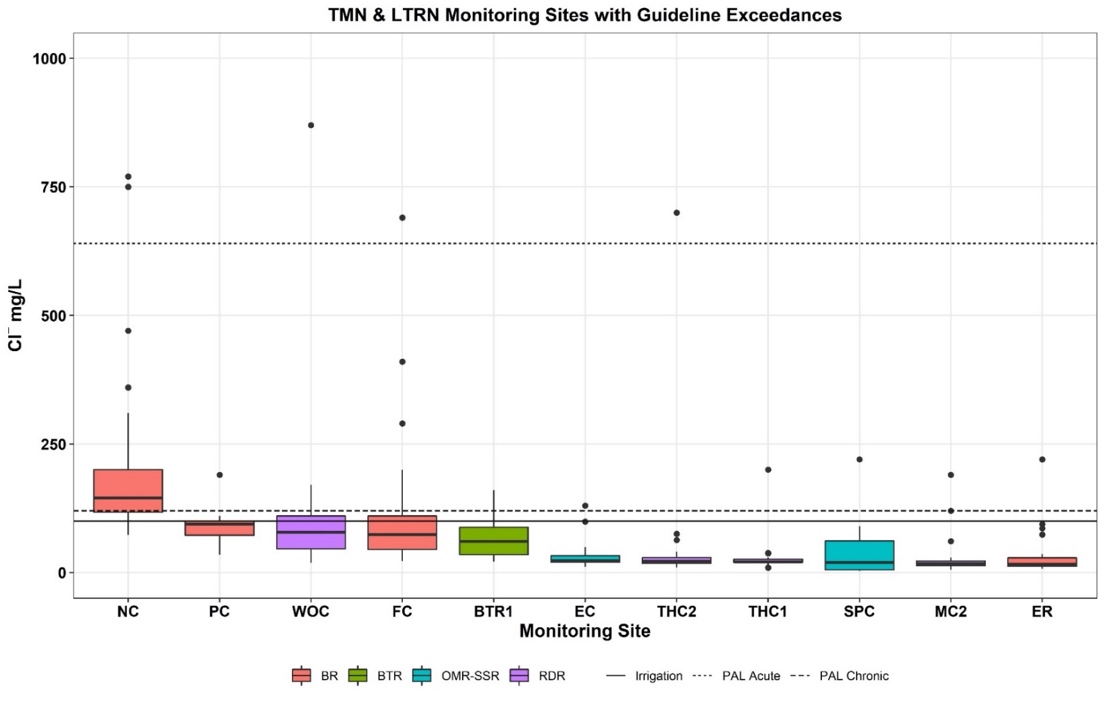 - For the 2016 to 2019 reporting period, upstream headwater monitoring sites often had lower Cl- concentrations that are frequently below analytical detection and thus cannot be precisely measured in water samples.