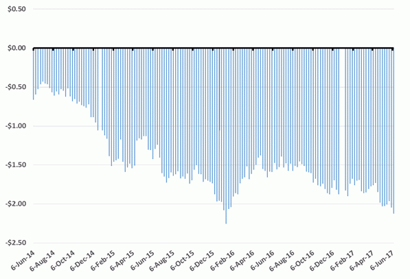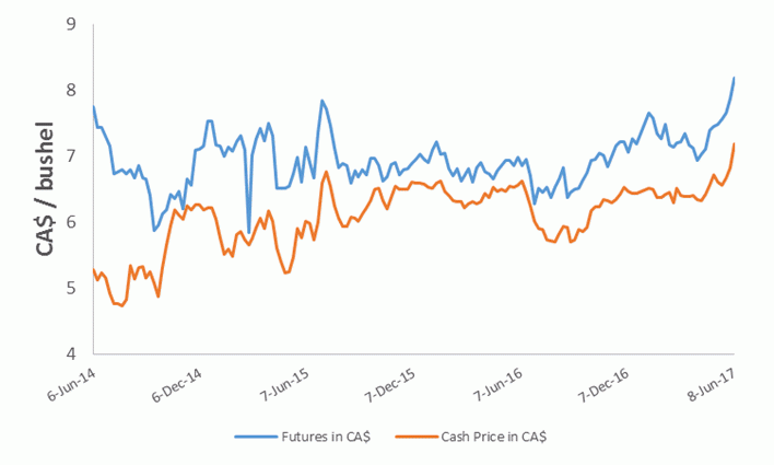 As reference, the below graphs illustrate central Alberta upper grade hard red spring wheat prices and basis levels from June 2014 to June 2017.