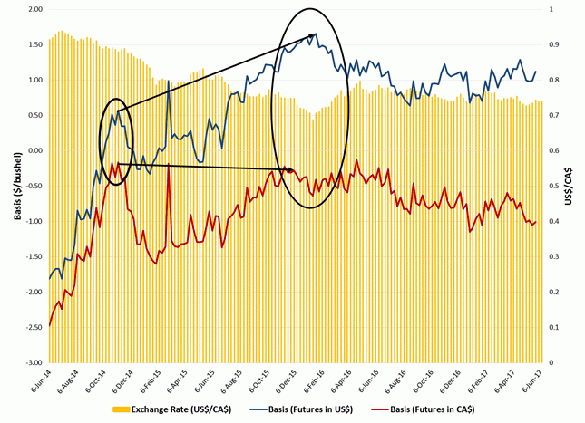 Calculating the basis using currency-adjusted futures results in a dramatically different result, especially with a weak Canadian dollar exchange rate. For those grain buyers that do not calculate the basis in this way, it is important that producers make the exchange rate adjustment in comparing basis levels of different companies.