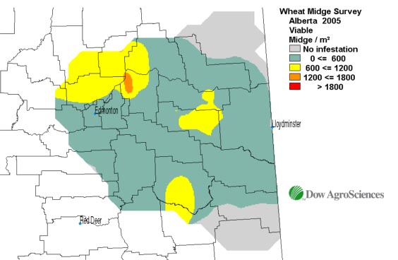 Low numbers of wheat midge were found distributed throughout the province, except in the Peace Region, where none were found. Wheat development in the Peace region was well ahead of the long-term average at the time when adult wheat midge pheromone trap capture peaked, so the midge may have missed susceptible wheat growth stages.