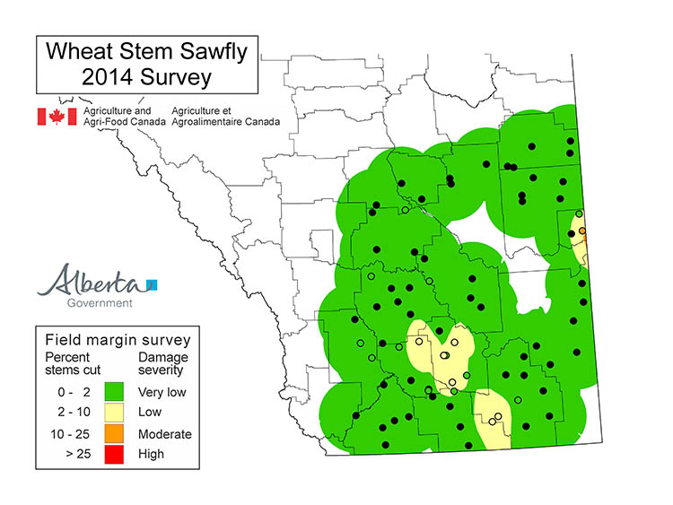 The area affected by sawfly cutting damage in 2025 has continued to decrease in Alberta. We are still seeing moderate to high cutting percentages in the traditional sawfly areas. The random nature of the survey means that individual fields may have higher wheat stem sawfly populations than are indicated in the survey map.