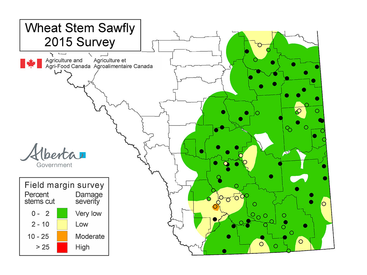 It is possible that population hot spots still exist in areas of lower risk, producers need to be aware of the potential risks in their own fields. Cutting levels of 10 to 15% or higher in the previous crop year indicate the need to consider planting non-host broad-leaf crops or oats to reduce sawfly losses. When populations are low it is typical to have small, localized populations of sawfly that affect only one field or even just a portion of one field. At lower populations, wheat stem sawfly also tends to have a very strong edge effect where they migrate into the current year crop from the previous year stubble.